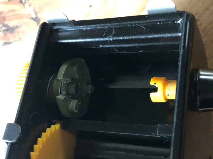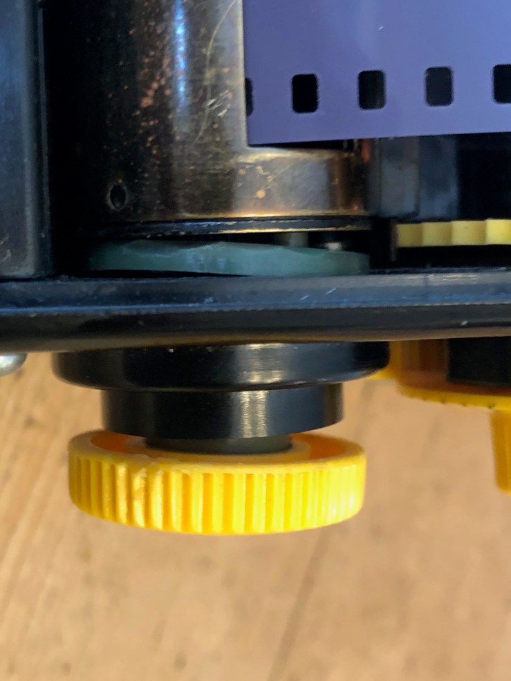 The Alden 74, like the various Watson models, incorporates an external knob (the yellow part in the photo below) that is used to close a Leica, Nikon or Contax cassette before removing it from the bulk loader. The external yellow knob is connected to an internal disk that holds the cassette in place and is supposed to move the little brass colored knob on the FILCA when the big yellow knob is turned. As shown in the photo below, the little knob keeps the disk from properly contacting the end of the cassette which results in the external yellow knob not seating properly. The practical effect is that, in my experience, it does not reliably close the cassette.